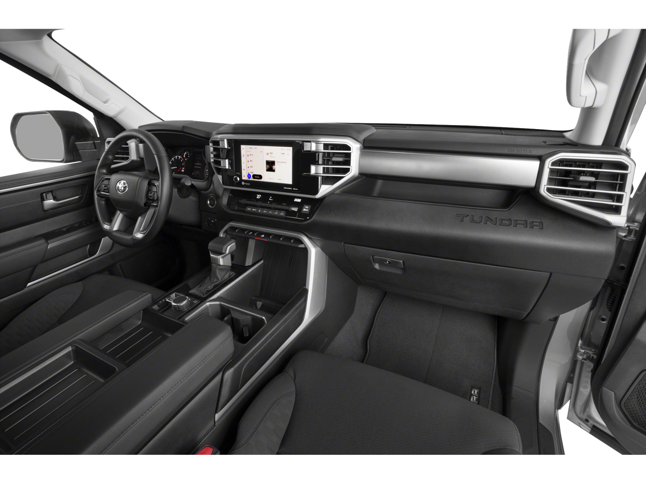 Inside, the Tundra SR5 offers a comfortable and well-appointed cabin. Premium features like heated leather-wrapped steering wheel, Apple CarPlay/Android Auto, and Blind Spot Monitor with Lane Change Assist ensure a seamless and enjoyable driving experience.